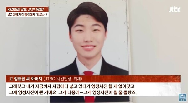 고인의 아버지 정모 씨는 28일 JTBC '사건반장'을 통해 아들을 황망하게 떠나보낸 심경을 전하며, 아들의 마지막 모습이 인천점 오픈을 위해 회사 숙소로 떠나던 날이었다고 밝혔다.